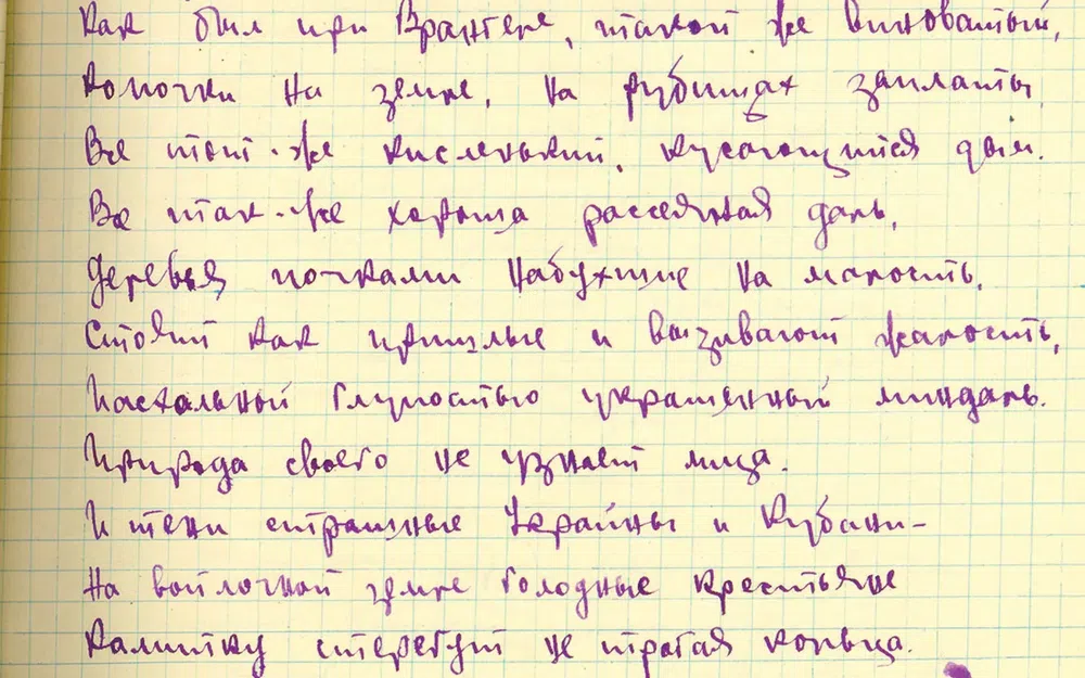 Этот вырванный из школьной тетрадки в клеточку листок с шестнадцатью строчками стихотворного текста и подписью поэта — страшный человеческий документ, главный обвинительный материал, основание для приговора. Вглядываясь в нервные чернильные строчки, видишь, что происходило с О. М., когда он решился это записать, как дрожала его рука, как не слушалось перо. По четыре, по пять раз окунал он ручку в чернильницу, чтобы записать одну строчку!