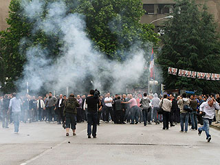 Сегодня после полудня группы этнических сербов и албанцев общей численностью до четырех тысяч человек собрались у моста и после "обмена любезностями" забросали друг друга камнями. До эскалации насилия дело не дошло из-за вмешательства натовского контингента KFOR, местных стражей порядка и полиции европейской Миссии в области верховенства закона.