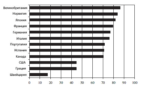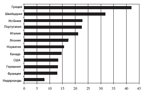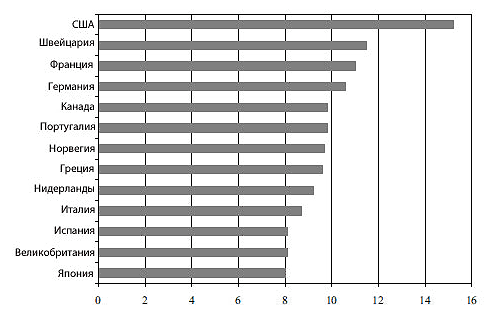 Примечание: данные по США приводятся за 2003 год.Источник: OECD Health Data 2007: Statistics and Indicators for 30 Countries. Paris: OECD, July 2007.