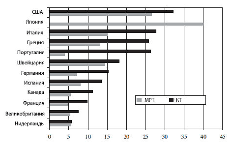 Рисунок 2. Количество аппаратов для магнитно-резонансной томографии (МРТ) и компьютерной томографии (КТ) на миллион жителей