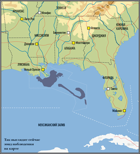 Еще один тревожный признак: американцы готовы сесть за стол переговоров с кубинцами и обсудить с ними тему общей угрозы, нависшей над пляжами северной части острова Свободы и островов Флоридской косы. Теплое круговое течение, которое входит в Мексиканский залив около полуострова Юкатан, а вытекает из него между Флоридой и Кубой, вот-вот может подхватить разлившуюся нефть и вынести ее в Гольфстрим. И тогда под угрозой загрязнения окажется Атлантическое побережье США, а это уже катастрофа безо всяких «но». Пока круговое течение и ветер постоянно меняются — разлившуюся нефть еще не «подцепило». Но если это все-таки произойдет, ее появление у берегов Флориды возможно в ближайшие дни. Бдительные флоридцы уже начали прочесывать пляжи и нашли нефтяные комки, правда, лабораторные дознания показали, что они состоят «не из той» нефти. Тем не менее пляжи Западной Флориды уже успели вылететь из десятки лучших в стране. Вообще нефть на белом песке выглядит пугающе, но зато и счищается хорошо: ее просто уносят с верхним слоем. Гораздо хуже дело обстоит с очисткой мангровых зарослей, топей, заболоченных берегов, а именно такие и расположены ближе всего к месту аварии.