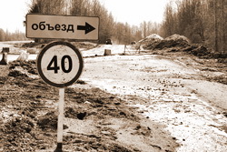 Ближе всего к Москве платный участок дороги, который срезает путь из Питера в Смоленск. Сразу за поворотом — большой указатель. По-русски и по-английски написано: «Внимание, вы въезжаете на платную дорогу». Сколько стоит проезд — не написано. Рядом стоит знак, предупреждающий о неровностях. Но это всего лишь лежачий полицейский. Видно, что дорогу строили, еще когда колхозы были в расцвете. Но она неплохо сохранилась. Возможно, потому, что по ней мало кто ездит. Мы простояли на перекрестке минут десять, прежде чем мимо нас на мопеде проехала пожилая колхозница. Еще через пять минут — «Нива» с псковскими номерами. Но местные машины освобождены от оплаты.