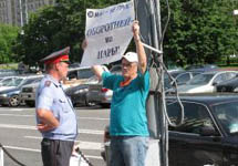Все участники одиночных пикетов задержаны после того, как по очереди выходили на площадь с плакатами "31 мая - не забудем, не простим", "Нургалиева - в отставку", "В Москве нет милиции". Их отвезли в ОВД "Якиманка".