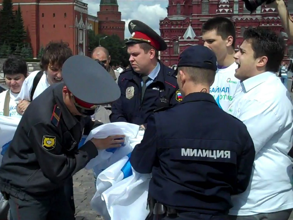 По первоначальному замыслу активисты намеревались в 11.30 развернуть белую растяжку с изображением озера "Байкал" у памятника маршалу Жукову и пройтись с баннером до храма Василия Блаженного.