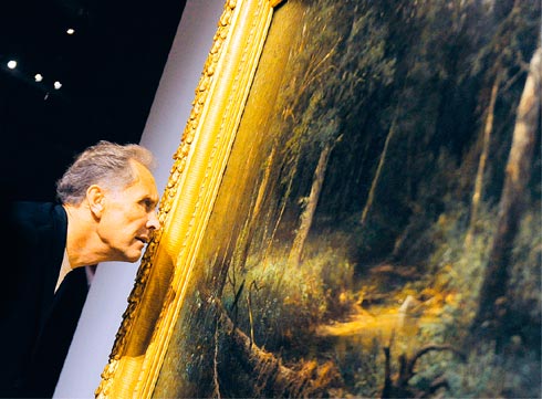 В мае в Историческом музее Москвы состоялась предаукционная выставка «Сотбис». Посетитель у картины Ивана Шишкина «Чернолесье»