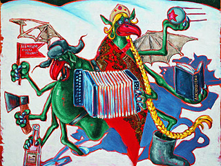 Недовольство представителей нескольких националистических движений вызвали картины "Химера загадочной русской души" и "Welcome To Russia". На первой - странные существа, которые, по словам самой художницы, изображают мужскую и женскую часть химеры. У того, кто символизирует сильный пол, - на голове шапка-ушанка. В одной руке флажок с надписью "Бей жидов, спасай Расею", в другой топор, в третьей бутылка водки. Женская часть химеры держит гармонь и книжку Достоевского. На этом существе кокошник, у нее длинная коса и валенок на ноге. Другая картина состоит из двух частей. Слева – нецензурная надпись, справа молитва. А слово Welcome написано с двумя буквами "Л".