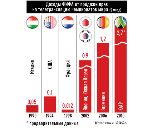Телевизионные рейтинги свидетельствуют: первенство мира по футболу традиционно одно из самых «смотрибельных» в мире событий. Предыдущий чемпионат в Германии 2006 года побил в этом смысле все рекорды: тогда за месяц трансляции матчей их посмотрело 50,4 млрд человек (то есть в среднем каждый житель Земли, включая грудных младенцев, — по 7,5 раза). Стоит ли удивляться, что от первенства к первенству ФИФА продает права на телетрансляции по все более высоким ценам. Скажем, за право показа матчей из Германии в 2006-м федерация получила $1,2 млрд, а продажа прав на телетрансляцию чемпионата из Южной Африки уже принесла ФИФА $2,7 млрд.