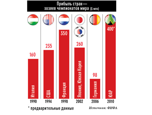 ” Впрочем, несмотря на миллиардные затраты, власти ЮАР не сомневаются, что смогут получить в итоге прибыль. То, что чемпионат мира по футболу — весьма выгодное предприятие, его организаторы поняли еще в 1930 году, во время первого мирового первенства в Уругвае. Тогда была заработана огромная по тем временам сумма — $255 тыс. В последующие годы прибыль стран от проведения Кубка мира исчислялась уже миллионами. Так, Германия заработала на первенстве около $98 млн. И это притом, что немцы выложили на строительство нескольких суперсовременных арен и другой инфраструктуры порядка $6 млрд. Франция провела свой чемпионат в 1998 году с меньшими затратами, что принесло ей $350 млн прибыли.