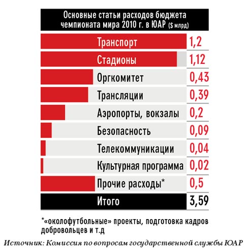 Именно в ЮАР Россия представила свою заявочную книгу на право принять чемпионат мира 2018 года. Энтузиазм авторов этой инициативы можно понять: хозяева чемпионатов, при всех своих солидных затратах, как правило, остаются по итогам первенств с прибылью, пусть и не столь существенной, как ФИФА. Южная Африка не исключение. И это притом что чемпионат мира по футболу в ЮАР обошелся в копеечку: прямые расходы на организацию и раскрутку турнира составили около $3,6 млрд. Самой затратной статьей таких соревнований для стран-организаторов всегда являются строительство и реконструкция спортивных объектов. Ведь чаще всего они либо вовсе отсутствуют, либо не соответствуют стандартам ФИФА. ЮАР с этим повезло: хотя для чемпионата и было построено 5 новых стадионов, а еще 5 — реконструировано, из-за относительной дешевизны материалов и рабочей силы это обошлось всего в $1 млрд. Для сравнения: Южная Корея и Япония, которые принимали чемпионат 2002 года, потратили на стадионы $5 млрд. Само проведение турнира обойдется Южной Африке в $1,6 млрд, и еще $1 млрд был направлен на раскрутку чемпионата. „