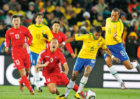 Северокорейский форвард Гон Тэ-Сэ (в красном) так и не смог догнать бразильского защитника Мишеля Бастоса