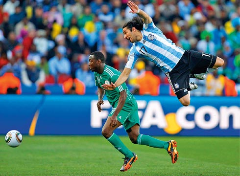 Полузащитник сборной Аргентины Хонас Гутьеррес успешно разрушал атаки, которые начинал нигерийский нападающий Гинеду Абаси. Итог — 1:0 — первая победа команды Диего Марадоны