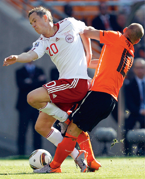 Датчанин Мартин Йоргенсен (на снимке слева) ничего не смог поделать с голландцем Весли Снейдером. 2:0 — победа Голландии, а Снейдер признан лучшим игроком матча