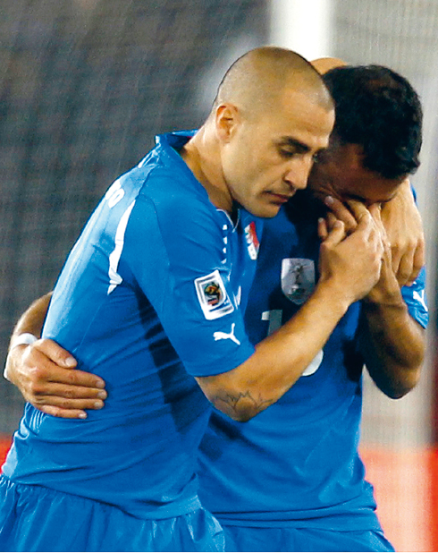 Легендарный итальянский защитник Фабио Каннаваро утешает партнера по команде после поражения в матче со Словакией