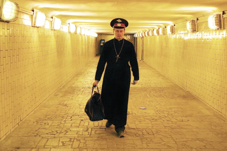 Акция группы война "Мент в поповской рясе"Дмитрий Волчек: Мы должны упомянуть о еще одной очень важной составляющей идеологии группы ''Война'': это презрение к культу денег, к культу бабла, который сейчас в России принял совершенно гротескные формы. Это и левое презрение к капитализму, и презрение к коммерческому искусству и продажному художнику, который готов на все ради того, чтобы получить подачку от власти или от любого клиента. Моя любимая акция группы ''Война'' была, в частности, об этом. Это акция ''Мент в поповской рясе''. Мне жаль, что она не стала такой известной, как вот эта последняя акция с фаллосом на мосту.