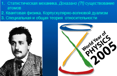 Если достаточно внимательно над ним поразмышлять, можно вспомнить фотометрический парадокс, задуматься над концепцией бесконечной однородной Вселенной и прийти к общей теории относительности и современной космологии. Конечно, не только основываясь на этом вопросе, но стартуя с него. Опираясь на другой естественный вопрос о том, почему люди не проваливаются сквозь пол, можно прийти к квантовой механике, и эту связь я постараюсь показать. Квантовая механика — это теория, которая, в каком-то смысле, решает проблему устойчивости материи. И третье важное событие — это торжество атомной гипотезы. Существенной и фундаментальной частью современной физики атомная теория стала в то же время, что и теория относительности и квантовая механика. Как всегда, работают много людей, а публике запоминать много фамилий неохота. И находится какой-то герой, который олицетворяет собой эту революцию. В данном случае это Эйнштейн. Всегда есть несправедливость в том, что труд многих людей ассоциируется с одним-двумя именами. Но если называть все-таки одно имя, Эйнштейн все же бесспорен. Физическое сообщество в 2005-м году отмечало мировой год физики в ознаменование столетия со дня публикации молодым Эйнштейном трех абсолютно фундаментальных статей, которые заложили основу трех абсолютно фундаментальных концепций современной физики.
