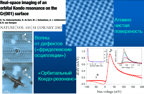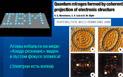 Это называется (показывает) атомный коралл. На поверхности меди выложен, атом за атомом, эллипс из атомов кобальта. И в один из фокусов эллипса помещен атом кобальта, а в другой — ничего не помещено. По неким причинам, если вы к такому магнитному атому на поверхности металла поднесете тип, вы увидите резонанс. Замечательная вещь состоит в том, что, если вы поднесете тип ко второму, пустому, фокусу эллипса, вы увидите практически такой же резонанс. Там ничего нет, но электроны есть волны. Можно показывать и другие картинки. Вот атомно чистая поверхность хрома.