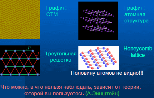 И, наконец, последнее — это история про графен, который сейчас принято считать самым важным, что произошло за последние годы в нанофизике. Хотя, строго говоря, графен никак не относится к наномиру. В одном направлении он слишком маленький, в другом — слишком большой. Графен — это одна из форм углерода. Есть две известные формы углерода: алмаз и графит, который более выгоден энергетически. Сравнительно недавно были открыты новые подклассы углеродных материалов. А графен — это отдельный монослой, который можно изолировать и изучать его свойства. Это произошло только в 2004-м году.