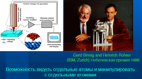 Она состоит из пятнадцати атомов ванадия, а каждый атом ванадия имеет спин. То есть это такой элементарный магнитик, который может быть направлен вниз или вверх. Они взаимодействуют. Мы рассчитали энергетический спектр этой системы. Видно, что тут есть состояния, которые отделены большими интервалами друг от друга. И, если речь идет о физике, вовлекающей эти состояния, то эта система будет вести себя как квантовая. Но если речь идет о физике, вовлекающей вот эти (показывает) состояния, то она будет вести себя как классическая. Это просто пример наносистемы, которая слишком большая, чтобы быть просто квантовой и слишком маленькая, чтобы о квантовых эффектах можно было полностью забыть. Это речь шла о теории, о нашем понимании наномира. Но физика — это наука, представляющая собой уникальное единство теории и эксперимента. То, что вообще не содержит экспериментальной части, на мой взгляд, физикой считаться не может. Разумеется, эта нанонаука не была бы возможна без методов экспериментального исследования наномира. Эти методы есть. Приведу пример устройства, которое, можно сказать, создало нанонауку.