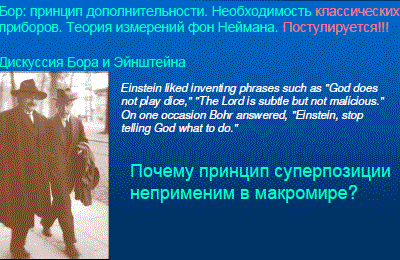 Михаил Кацнельсон (фото Наташи Четвериковой) Хорошо известно высказывание Эйнштейна «Бог не играет в кости». Гораздо менее известен ответ Бора: «Эйнштейн, прекрати говорить Богу, что ему делать». Но дальше возникает серьезнейший вопрос. Квантовая механика в самой себе не содержит указаний на пределы своей применимости. Она настаивает на том, что она универсальная теория. Но тогда мы вообще ничего не можем сказать. Если нет разницы между электроном и футбольным мячом, то мы ничего не можем сказать о мяче. А значит, вообще ни о чем. Потому что физика — это обсуждение результатов измерений. Измерения — это результат взаимодействия изучаемого объекта с неким устройством, которое мы считаем измерительным прибором. И приборы должны давать достоверные показания. И в этом смысле сложившееся описание квантовой механики, которое принято называть копенгагенской интерпретацией, основано на постулировании существования некоторых классических объектов. Приборы должны быть классическими. Но сама квантовая механика никаких ограничений на свою применимость к большим объектам не имеет. Ситуация здесь принципиально отличается от той, которая имеет место, когда мы обсуждаем соотношение классической механики и теории относительности. Теория относительности не нуждается в том, что сначала дала классическая механика. Мы можем с самого начала учить школьников теории относительности, если мы совсем сошли с ума, а потом в самом конце сказать — вот, знаете, тут везде в формулах такая буква, это скорость света, так вот, в повседневной жизни ее можно устремить к бесконечности. Квантовая же механика имеет смысл, только если в мире есть классические объекты. Принцип суперпозиции — это утверждение о волновой природе всего на свете — явно не применим в макромире. Это и был основной вопрос в этой знаменитой дискуссии Эйнштейна и Бора. Был предложен знаменитый мысленный эксперимент с котом Шредингера.