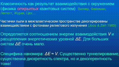Вопрос из зала: У вас был слайд, на котором вы давали определение наносистем, а именно систем, где можно наблюдать квантовые эффекты. Есть ли какая-нибудь теория, которая могла бы как-нибудь описать, в какой степени проявляются квантовые эффекты?