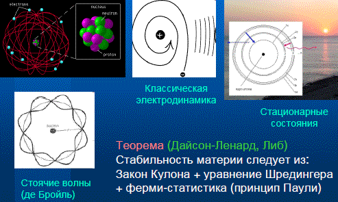 Но факт в том, что устойчивость материи, состоящей из электронов и ядер, сейчас доказана строго, на уровне теоремы. Очень важно, что без квантовых законов эту теорему доказать нельзя, более того, можно построить к ней контрпримеры. Материя устойчива, потому что положительные и отрицательные заряды притягиваются и отталкиваются по закону Кулона, потому что они описываются как волны и потому что они подчиняются определенным статистическим правилам, так называемому принципу Паули, говорящему, что нельзя посадить два электрона в одно и то же квантовое состояние. Чтобы объяснить фундаментальный факт устойчивости материи, пришлось пожертвовать очень многим: предсказуемостью индивидуальных событий. Одним из проявлений этой непредсказуемости является знаменитое соотношение неопределенностей Гейзенберга.