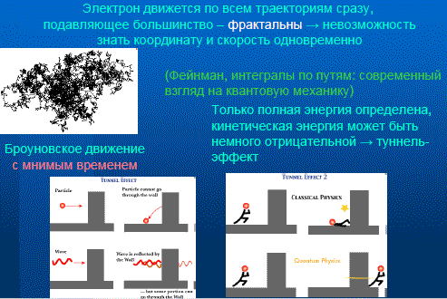 Многие слышали об ограничениях, которые квантовая механика накладывает на нашу возможность описать движение частиц. Утверждается, что нельзя одновременно измерить координату и скорость объекта в тот же самый момент времени. Современная формулировка квантовой механики основана на так называемой картине интегрирования по путям. Согласно этой картине, если вы хотите описывать электрон как классическую частицу, вы можете это делать, но вы должны постулировать, что электрон движется не по одной единственной траектории. Он движется по всем траекториям сразу. И в типичном случае эти траектории представляют собой кривые, не дифференцируемые ни в одной точке. Они напоминают броуновское движение. Утверждение о невозможности одновременного измерения координаты и скорости частицы приводит к важнейшим наблюдаемым эффектам. Например, на этом основан так называемый туннельный эффект, который будет использоваться и дальше в моем докладе. Основан он вот на чем. Есть закон сохранения энергии. Он справедлив в классической механике и в квантовой механике. Энергия в классической механике может быть представлена как сумма кинетической и потенциальной энергии. Потенциальная зависит от положения частицы, кинетическая — от скорости. И что же происходит в ситуации, когда классическая частица налетает на стенку? Частица отразится. А в квантовом? Соотношение неопределенностей говорит, что разделение на кинетическую и потенциальную энергию условно, поскольку нельзя одновременно знать и скорость, и координату. Кинетическая энергия может быть немножко отрицательной. Это значит, что, чем больше это нарушение, тем меньше вероятность такого события. Хочу подчеркнуть, что квантовая механика говорит только о вероятностях. И чем шире стенка, тем меньше эта вероятность, но она никогда не равна нулю.