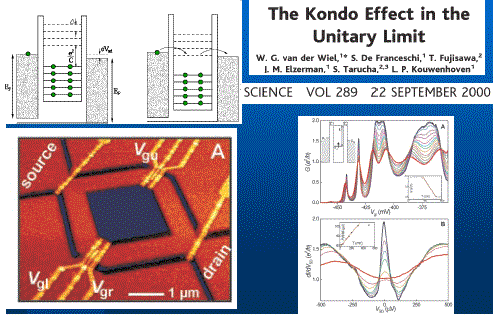 Другой пример нанообъектов — это так называемые квантовые точки. Это такие вот устройства (показывает), к которым подведены контакты. У этих устройств энергетический спектр дискретен, состоит из отдельных уровней, как и должно быть по законам квантовой механики. В атоме типичное расстояние между этими уровнями — это энергия, которую приобретает электрон, ускорившись на разнице потенциалов, скажем, 10 вольт. Эта вот наночастица большая, спектр у нее дискретный, но расстояние между уровнями много меньше, чем для атома. И каждый раз, когда потенциал в проводах совпадает с одним из резонансных уровней, через это дело будет течь ток. А когда не совпадает, тока не будет. Поэтому, измеряя зависимость тока от напряжения, можно измерять этот квантовый спектр. Это типичный пример нанообъекта. Он одновременно и квантовый, и классический, поскольку взаимодействие с проводами здесь существенно.