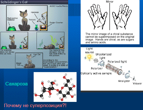 Я не буду вам рассказывать про кота, а буду — про молекулу сахара. Но это одна проблема. Если вы растворите сахар в воде, полученный раствор будет обладать свойством оптической активности, то есть поляризованный свет будет вращаться в определенном направлении. Это значит, что сахароза в принципе может существовать в правой и левой форме, но в мире реализуется либо правая, либо левая. Если принцип суперпозиции применим без ограничений, невозможно понять, почему все эти молекулы не являются суперпозицией состояния правого и левого. Просто сказать, что молекулы большие, а кошка еще больше, недостаточно. Я не могу сказать, что эта проблема решена. Но есть некая популярная точка зрения. Декогерентность. Есть некая исследовательская программа, которая объясняет классичность через декогерентность.
