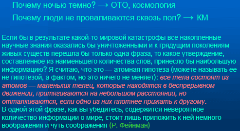 Он ввел некий понятийный аппарат: абсолютное пространство, абсолютное время, материальные точки, силы, действующие между ними, которые, как думалось, могли послужить основой физики. Потом, в ХIХ-м веке, картина мира была установлена еще раз. Я имею в виду работы Фарадея и Максвелла, которые ввели концепцию электромагнитного поля. Эта концепция по меньшей мере столь же глобальна, сколь и концепция классической механики. Это полный переворот и существенное углубление нашего понимания природы. Это очень важная вещь. Есть очень вызывающее высказывание Фейнмана, что, с его точки зрения, «важнейшим историческим событием ХIХ-го века было построение теории электромагнитного поля Максвелла, и на этом фоне Гражданская война в США выглядит мелким недоразумением». Понятно, что это сказано так, чтобы заострить, чтобы подчеркнуть роль физики. Но если мы подумаем, как то развитие, которое началось с создания классической электродинамики, изменило жизнь миллиардов людей, это высказывание не покажется преувеличенным. При этом я хочу подчеркнуть следующее. Очень часто говорят о научных революциях. Но надо все правильно понимать. Концепция электромагнитного поля не убила ньютоновскую классическую механику. Старые плодотворные физические концепции никуда не деваются, не умирают. Развитие классической механики происходит и в наше время: появляются новые идеи, новые результаты. Уже после создания электродинамики, в рамках классической механики, которая, казалось бы, уже отброшена, появилась принципиально новая идея, дальнейшее развитие которой привело к возникновению концепции детерминистского хаоса. Так что классическая механика жива, но мы просто знаем широкий круг явлений, для которых она недостаточна. Это предыстория. Дальше произошла серия революций, на рубеже ХIХ-го и ХХ-го вв. С этого и началась современная физика. Как я уже говорил, науку можно вывести из наивных детских вопросов по поводу окружающего нас мира. Эту связь важно не забывать. Научные проблемы не должны быть высосаны из пальца. Они должны быть естественными. Новые концепции новой научной революции, в каком-то смысле, могут быть выведены в результате напряженного размышления над вполне детскими вопросами. Например, детский вопрос: «Почему ночью темно?»