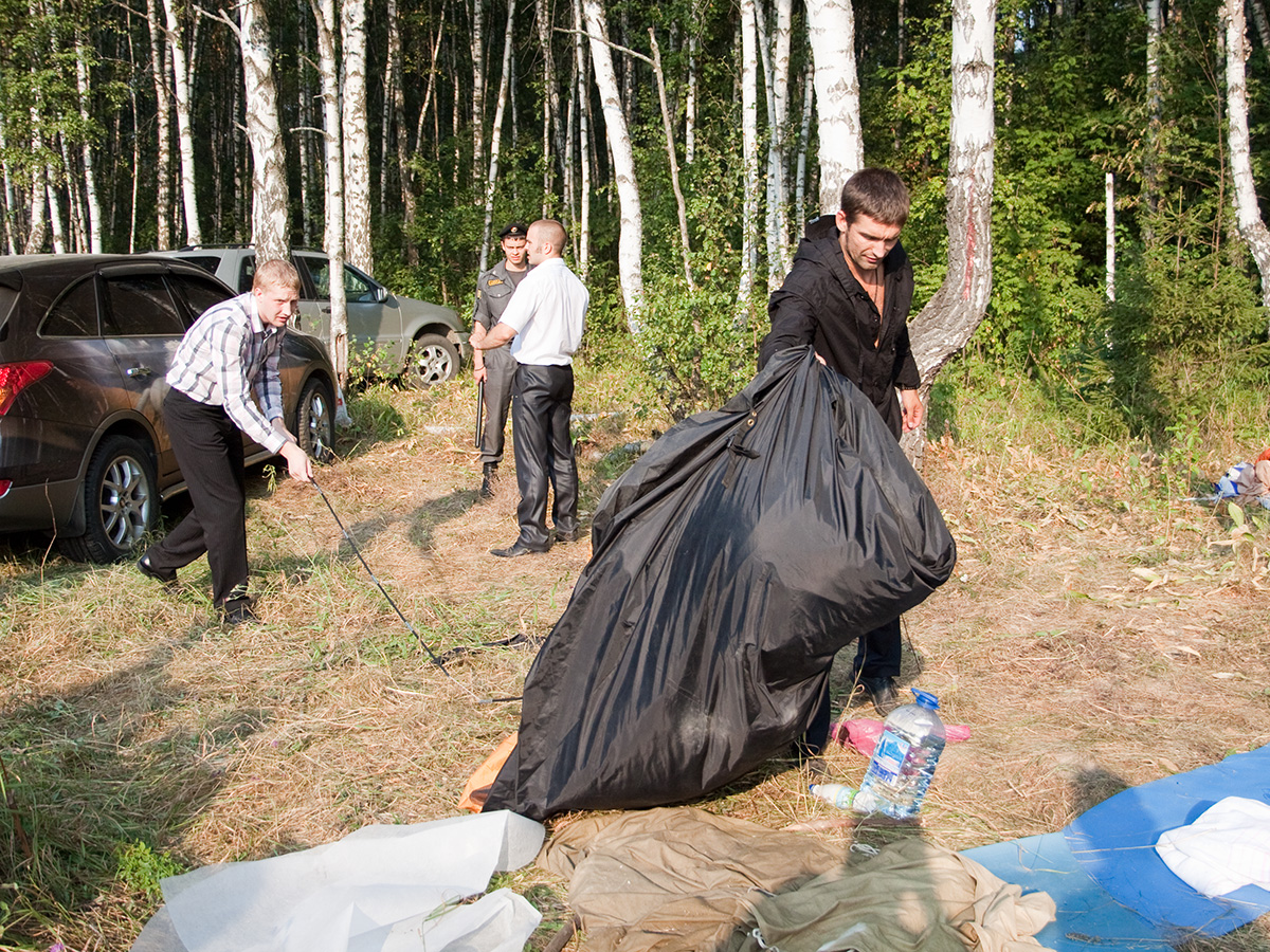 В отличие от сотрудников правоохранительных органов, которые дежурят возле строительной техники и ведут себя относительно корректно, неизвестные люди в гражданском – агрессивны. Они не позволяют ни снимать, ни передвигаться по лесным тропам и дорогам и откровенно угрожают физической расправой. Естественно, никто из них не представляется и документов не показывает. Первый лагерь, где экологи дежурили несколько дней и ночей подряд, разрушен, защитники Химкинского леса установили палатки в другом месте. О событиях последних суток рассказал эколог Максим Степанов: