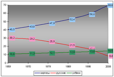 Процесс этнизации Киргизской республики не просто продолжится. Уже в ближайшее время произойдет скачок показателя моноэтничности. Приходится признать: в этот раз киргизский национализм выиграл. Это стало возможным только потому, что киргизское государство идеологически все эти годы поощряло моноэтнизацию, полагая данный процесс условием укрепления ее государственного суверенитета. Надо понимать, что современная политика этнизации идет лишь в русле трендов, которым уже более полувека. Взглянем на график, демонстрирующий динамику этнического состава КР (%, 1959, 1970, 1979, 1989, 1998, 2008 гг.).