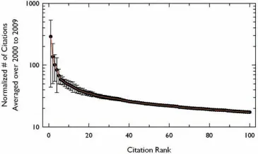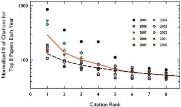 Автор использовал данные из базы ISI. Им было выделено по сотне самых цитируемых статей за каждый год последнего десятилетия (20002009). Существенно, что цитируе-мость считалась на момент составления выборки (т.е. статьи 2009 г. имели меньше времени для набора ссылок, чем статьи 2000 г., этот эффект потом убирался нормализацией). Кроме этого, были добавлены самые цитируемые статьи за 1990 и 1995 гг., чтобы посмотреть тренды на большем масштабе времени. В итоге, рассмотрено 1200 статей.