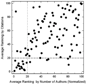 В астрономии не только уменьшается доля статей с одним автором, не только падает их число среди высокоцитируемых статей, но и просто растет среднее число авторов на статью (хотя, конечно, это свойственно не только астрономии, как показано, например, в работе [4]). Но, тем не менее, статьи с одним автором все-таки изредка попадаются даже среди самых цитируемых и сейчас! В ApJ в 1990-1999 гг. в среднем у статьи было 3,8 автора. Спустя 10 лет среди статей из ApJ, попавших в список наиболее цитируемых, в среднем у статьи уже 8 авторов. Среднее число авторов растет потому, что уменьшается число статей с числом авторов менее 5. Кроме того, просто увеличивается число индивидуальных авторов (оно удвоилось за 10 лет), т.е. все больше людей попадает в число авторов статей, в том числе и среди самых цитируемых. Рост числа уникальных авторов превосходит рост числа членов МАС (Международный астрономический союз), числа членов ААО (Американского астрономического общество) и других подобных индикаторов числа астрономов в мире. Это может происходить в основном за счет включения в соавторы инженерных команд и молодежи. Среди 1000 рассмотренных статей 18 % имели более 25 авторов, 6,5 % — более 50, и 3,5 % — более 100. Также в последние годы все чаще человек фигурирует в более чем одной работе из числа топ-100 за данный год.
