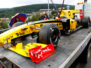 Российский гонщик команды "Рено" Виталий Петров разбил машину в начале квалификации на Гран-при Бельгии - 13-го этапа чемпионата мира в автогонках "Формулы-1". На второй минуте первой квалификационной сессии Петров наехал на мокрый бордюр в 9-м повороте трассы в Спа и потерпел аварию. Гонщик сам выбрался из болида, но уже не продолжит соревнования.
