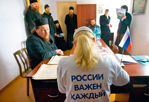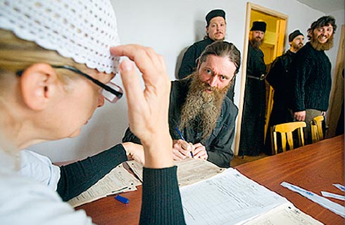 Абсурдно, но о семейном положении людей в рясах все же спрашивают. «Не женат, русский, владею греческим» — эту стандартную формулу The New Times довелось услышать почти от каждого из членов обители. Отличился от братии только наместник епископ Панкратий. Помимо знания греческого он продемонстрировал высокий уровень сознательности, заявив The New Times, что к переписи монахи «относятся как к выполнению гражданского долга».
