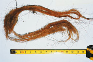 «Мамонтёнок Дима» с реки Киргилях. Возраст — шесть-семь месяцев. Высота в холке — 1 м 4 см, длина — 1 м 22 см. На фото внизу: две пряди ювенильной («детской») шерсти этого детёныша.