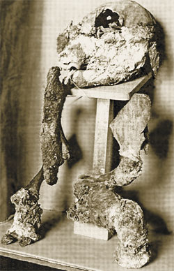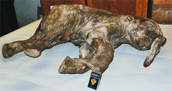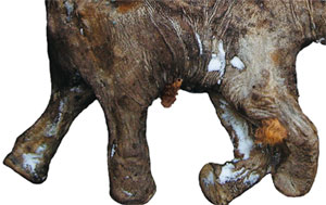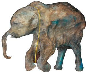 «Мамонтёнок Маша». Возраст — один-два месяца. Высота в холке — около 69 см, длина—1 м 25 см. На задней поверхности правой задней стопы видны повреждения, которые, видимо, и вызвали его гибель. Хранится в Зоологическом музее РАН. Фото Евгения Мащенко.