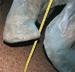 На передней поверхности передних стоп «мамонтёнка Любы» сохранились углубления от ногтевых (копытных) фаланг — по три на каждой ноге.