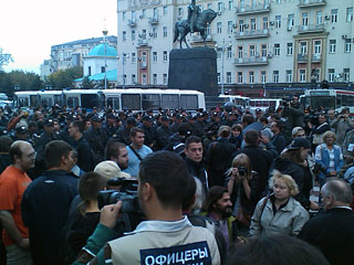 Сотрудники милиции, выставив оцепление из военнослужащих Внутренних войск МВД РФ, оттеснили людей вдоль по Тверской улице в направлении Охотного ряда и Пушкинской, а также вниз по Тверской площади в сторону улицы Большая Дмитровка.