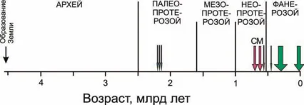 Возможно, не все знают, что, несмотря на разговоры о глобальном потеплении, мы живем сейчас в холодную эпоху. Ледниковые периоды длительностью в сотни тысяч лет сменяются короткими, примерно в десяток тысячелетий, перерывами межледниковья, и последний из них — голоценовый период — как раз подходит к своему концу (см. врезку 1). Сегодня на Земле достаточно комфортно жить, в то время как раньше бывали существенно более холодные времена. Кроме текущей холодной эпохи, возможно начавшейся еще в эоцене, примерно 40 млн лет назад, и достигшей кульминации в последние 2,5 млн лет, известно еще как минимум восемь холодных эпох, две из которых пришлись на фанерозой, три — на неопротерозой и еще три — на палео-протерозой (рис. 1).