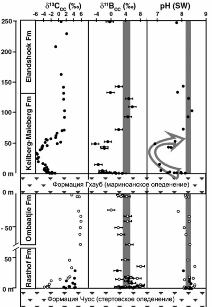 Образцы покровных карбонатов для исследований отбирались с трех классических разрезов в Намибии. Обычно для реконструкции химизма воды используются изотопы углерода. Однако некоторые авторы считают, что измеренные вариации изотопов углерода в карбонатах отражают не первичные характеристики в морской воде, а постседиментационные изменения. По этой причине важным дополнением оказался анализ изотопных вариаций бора. На рис. 2 показаны значения, измеренные в карбонатах, а также реконструированные по изотопам бора значения рН в морской воде. Удивительным оказалось то, что снижение значений 513С в карбонатах после стертов-ского оледенения не сопровождается таким же снижением значений 5nB. Последнее указывает на неизменность pH в морской воде во время и после оледенения. После мариноанского оледенения значения 513С и 5nB ведут себя когерентно — резко снижаются, а затем возрастают до нормальных значений. Соответственно pH в морской воде резко снижалась после оледенения на некоторый короткий промежуток времени. Именно такой характер поведения изотопов углерода и бора ожидается исходя из модели «снежного кома». Из-за полной изоляции океана от атмосферы в результате покрытия территории Земли толстым слоем льда углекислый газ накапливался исключительно в атмосфере, вместо того, чтобы растворяться в воде и осаждаться в виде карбонатов. В результате происходило накопление CO2 и возникал парниковый эффект, который провоцировал резкое плавление льда, быстрый рост кислотности океана из-за резкого насыщения углекислотой воды и возвращение системы в обычное состояние. Альтернативным объяснением может быть и разрушение слоя газогидратов после стадии оледенения.