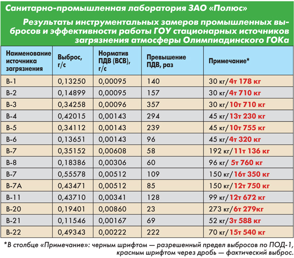 Вот реальные цифры: замеры проводились в 2009 году. Поясню, что нормативы ПДВ (предельно допустимых выбросов) нам ежегодно рассчитывает наука, на что компания тратит немалые деньги. (Таблица, предоставленная Востровым, содержит 13 столбцов и 60 строк. Я взял только самые необходимые столбцы и сократил строки, оставив лишь цифры, касающиеся выбросов гидроцианидов. — А. Т. ).