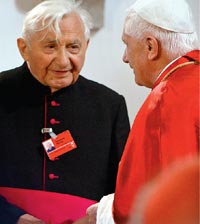 | Йозеф Ратцингер (папа Бенедикт XVI) со старшим братом Георгом (слева) во время визита в родной Марктль четыре года назад. Георга тоже пытаются связать с педофильским скандалом |