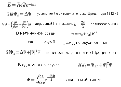 В природе все среды в той или иной степени нелинейны, то есть у них показатель преломления зависит от амплитуды распространяющейся волны. Если волна имеет малую амплитуду, то это несущественный эффект. Если же, скажем, лазерный луч, очень мощный, то эффект уже весьма заметный. Коэффициент преломления, конечно, усреднено реагирует на эту волну, то есть входит в квадрат модуля этой амплитуды. Если коэффициент положительный, то среда называется фокусирующей. В таком случае к уравнению Леонтовича нужно добавить один нелинейный член — и получится нелинейное уравнение Шредингера. Это и есть чрезвычайно общая модель, описывающая множество явлений и применимая к очень многим задачам.