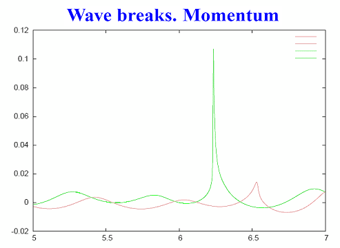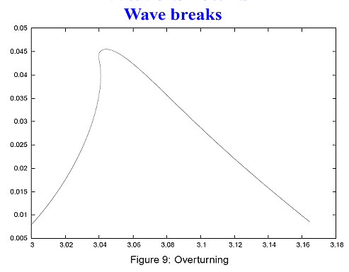 В следующем фильме представлено то же самое явление в аксонометрической проекции. Видите, как возникают экстремальные фокусы. Это, конечно, чудо вычислительной техники. Численный эксперимент был сделан в городе Альбукерке в университете Нью-Мексико, где ученик моего ученика (члена-корреспондента РАН Е.А. Кузнецова) Паша Лушников сейчас профессор. Ему помогает одна русская девушка. Вот мы видим экстремальные волны.