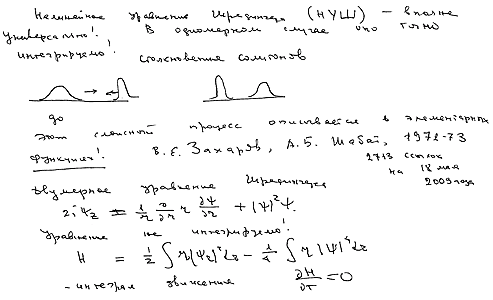 Вторым примером таких интегрируемых систем было нелинейное уравнение Шредингера, по которому выяснилось, что существует множество неизвестных ранее интегрируемых систем (сейчас, я думаю, счет идет на сотни, уже есть сотни две, может быть). Я даже не знаю их все и ориентируюсь примерно: это к такому классу относится, а это к такому. Запомнить это трудно: их действительно много и далеко не все из них имеют физическое применение.