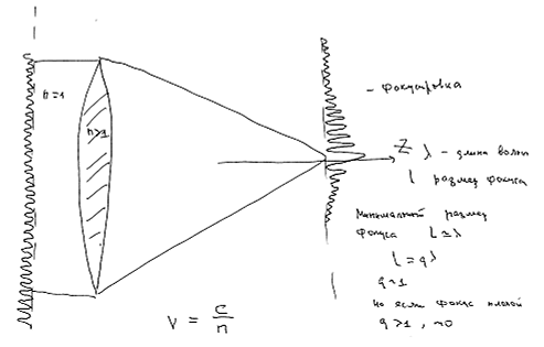 Фокусировка происходит за счет того, что внутри линзы коэффициент — показатель преломления n — больше единицы и, соответственно, скорость распространения световых волн немножко меньше, чем в вакууме. Это свойство стекла: чем больше n, тем лучше стекло преломляет.