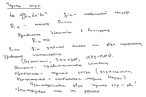 Уравнение Эйнштейна в пустоте представляет собой требование, чтобы тензор Риччи был равен нулю. Это уравнение, вообще говоря, в четырехмерном пространстве, значит, что метрический тензор g(ik) содержит 10 функций от четырех переменных. Если мы найдем частное решение, вместо 10 функций возникнет у нас всего 3 независимых функции, будет симметричная матрица 2x2, зависящая от двух переменных. Если она зависит от двух переменных, будут некоторые уравнения (я их не пишу, чтобы не перегружать), но они окажутся тоже интегрируемыми, как нелинейное уравнение Шредингера. У этих уравнений тоже есть солитонные решения.