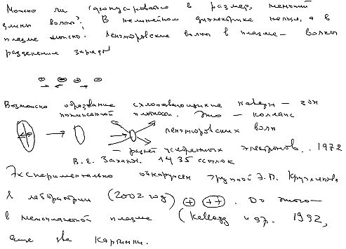 Это явление называется коллапсом ленгмюровских волн. Теоретически оно было предсказано в 1971 году. Эта моя работа также включена в число наиболее цитируемых российских авторов, но уже находится в конце списка — там примерно 1500 ссылок (меньше людей занимается плазмой, чем нелинейной оптикой, и математически имеющиеся там уравнения не столь замечательны). Экспериментально это явление обнаружено сравнительно недавно. Это очень трудный эксперимент.