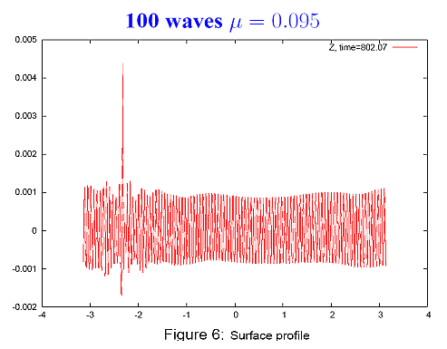 Теперь я хочу показать еще один фильм. Все определяется тем, насколько сильна нелинейность. В линейной теории, как известно, ничего не происходит. Все определяется степенью крутизны. Та картинка, которую я показывал, имеет крутизну 0,07, а эта вот 0,14. Как вы видите, крутизна 0,14 выдает уже образование настоящих freak-waves. (videoclip: 5Sol_Steep-0.14)